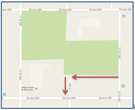 If you’re planning to drop off or pick up your kids near the playground, please enter the cul-de-sac via 10 Street SW through the back alley that runs parallel to the large field, and then exit only through the cul-de-sac.
